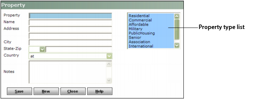 This selection affects which tabs appear on the Property screen and whether Voyager uses the Resident or Lease screen for tenants of the property. It also determines which unit Rental Types are available for the property. For information about rental types, see “Unit Screen Reference”.