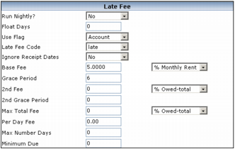 Lease Charge Late fees apply only to rent lease charges for which the Subject to Late Fee check box is selected on the Rent Schedule screen. For information about the Rent Schedule screen, see “To add a rent schedule” in the Commercial User's Guide.