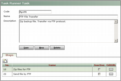 5 Add new steps, as needed. If you want to review or edit a specific step in the Steps table, click the EditURL button in the row. The Task Runner Step screen for that step appears. For more information about editing a step, see “Task Runner Task Setup Examples”.